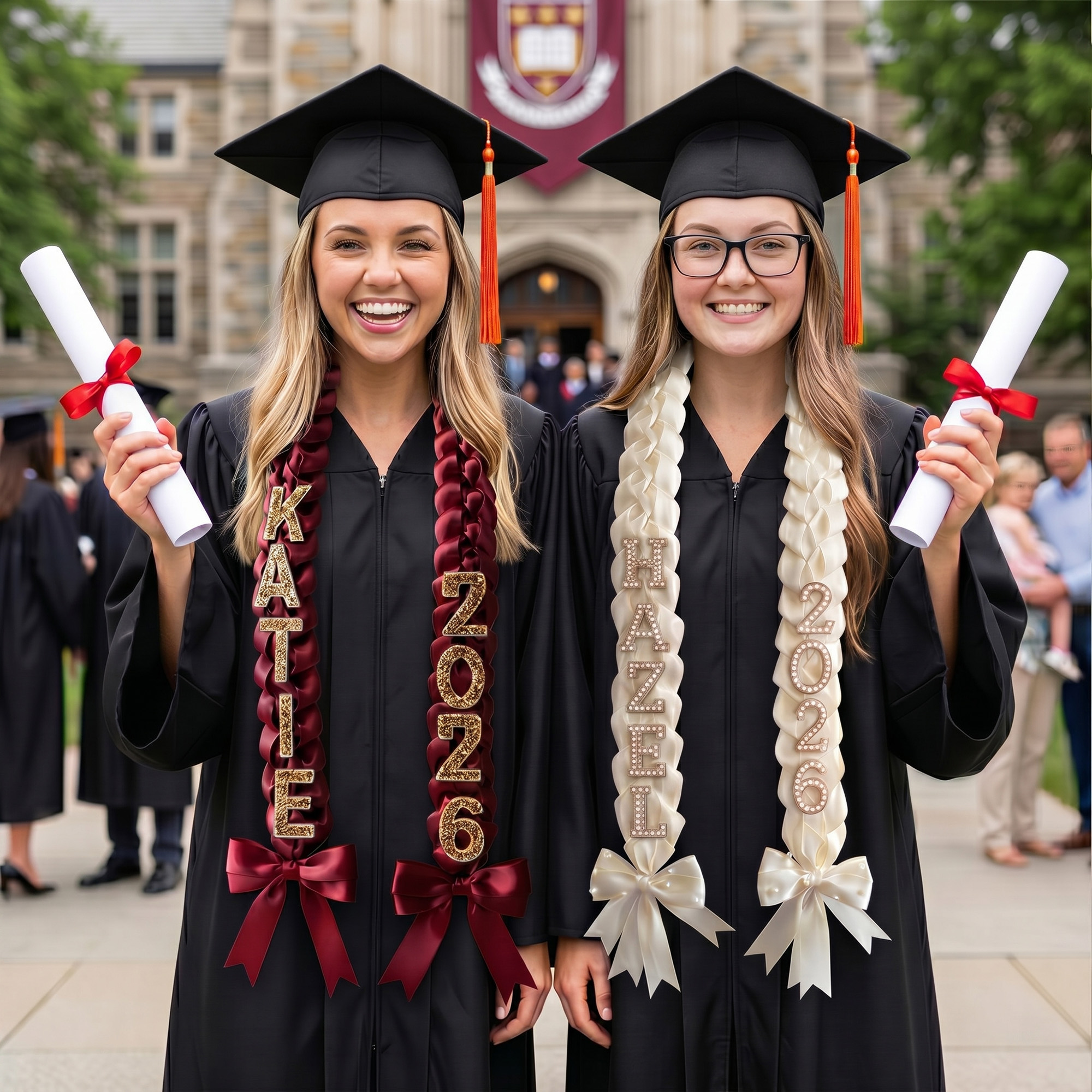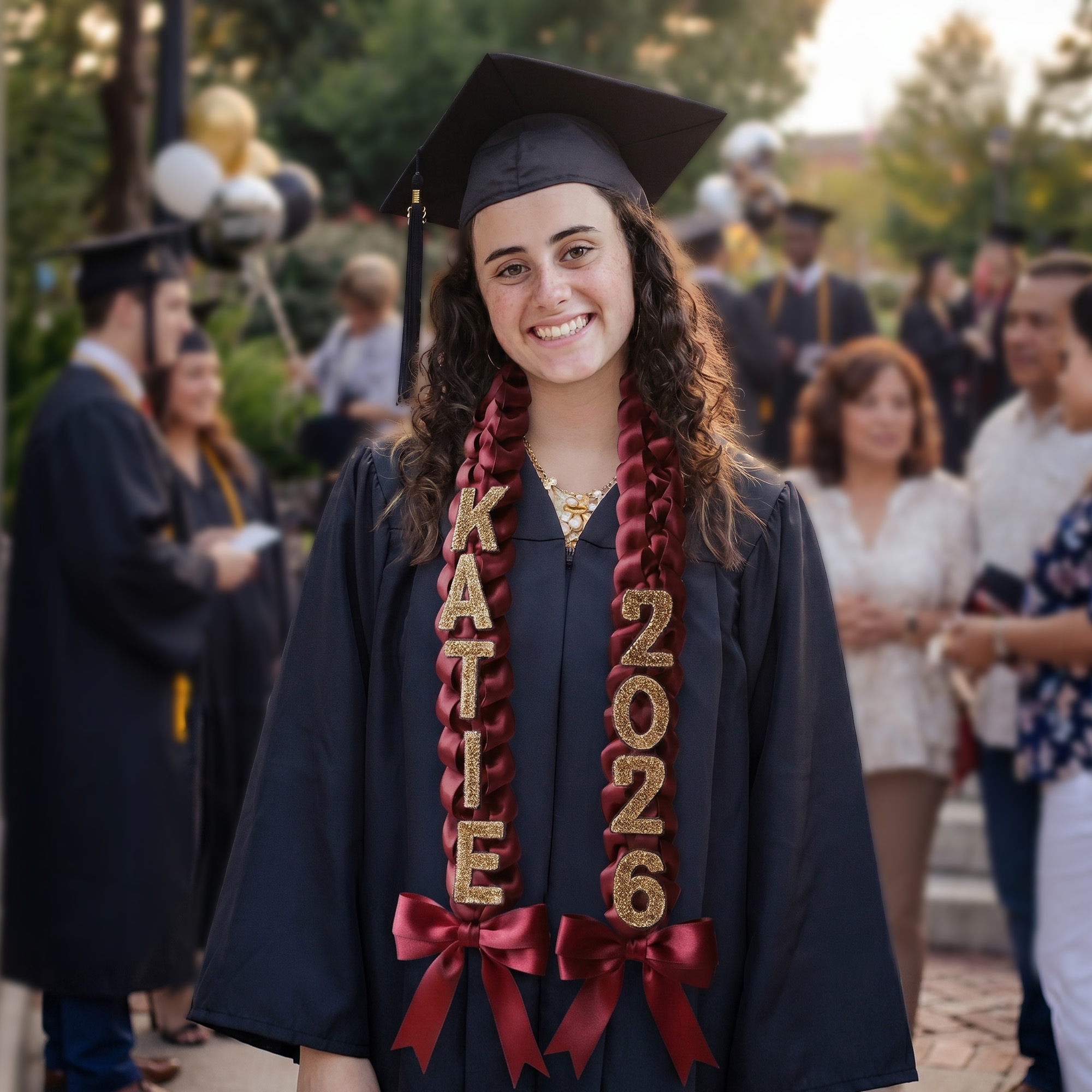 Unlike fresh floral leis, our ribbon leis won’t wilt, brown, or trigger allergies. They are designed to be draped over the graduation gown and kept as a cherished memento of academic achievement for years to come.